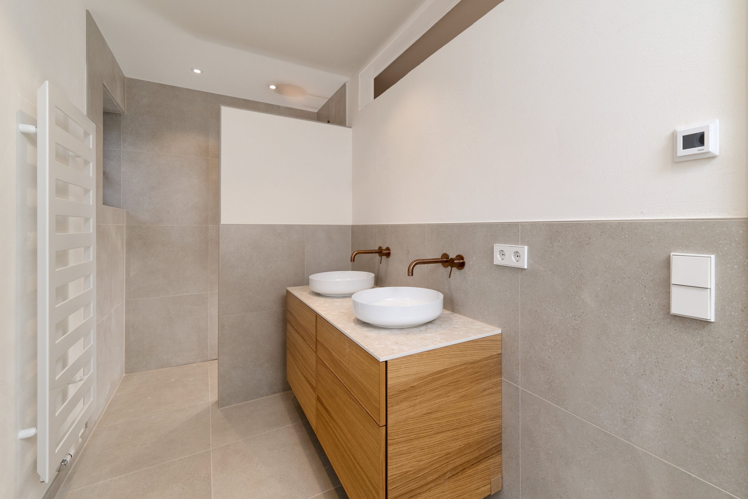 Ziel war eine hochwertige, langlebige und zugleich wohngesunde Ausführung sämtlicher Flächen sowie eine ästhetisch anspruchsvolle Gestaltung der Bäder, Böden und Wandoberflächen.